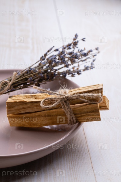 Натуральные благовония: пучок палочек пало-санто и пучок сухой лаванды крупным планом с акцентом на пучок палочек пало-санто
