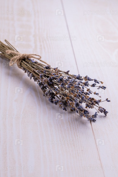 Букет сухой лаванды — натуральный аромат для дома на светлом деревянном фоне. Крупный план. Скопируйте пространство