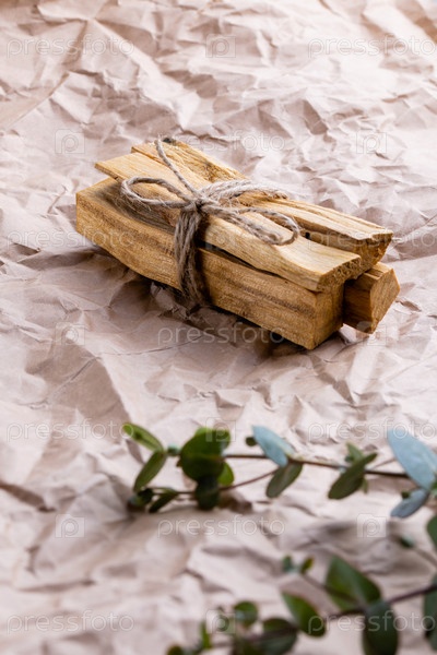 Благовония для домашнего аромата и медитации, палочки пало санто и веточки эвкалипта крупным планом с акцентом на связку палочек пало санта