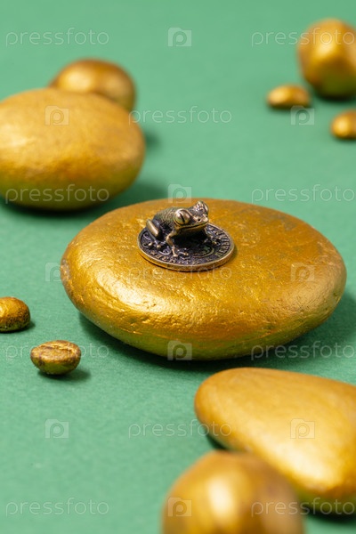 Талисман для привлечения богатства - металлическая денежная лягушка на зеленом фоне, надпись на русском языке деньги к деньгам. Крупный план и выборочный фокус на лягушке, место для копирования текста