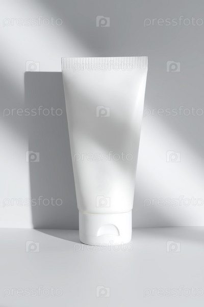 Кремовая трубка на ярком солнечном белом фоне. Косметический продукт по уходу за кожей пустой пластиковый пакет. Белый нефирменный лосьон, бальзам, макет крема для рук. Флакон с солнцезащитным кремом
