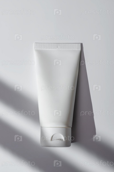Кремовая трубка на белом фоне. Косметический продукт по уходу за кожей пустой пластиковый пакет. Белый нефирменный лосьон, бальзам, крем для рук, макет зубной пасты. Бутылка солнцезащитного крема с копией пространства