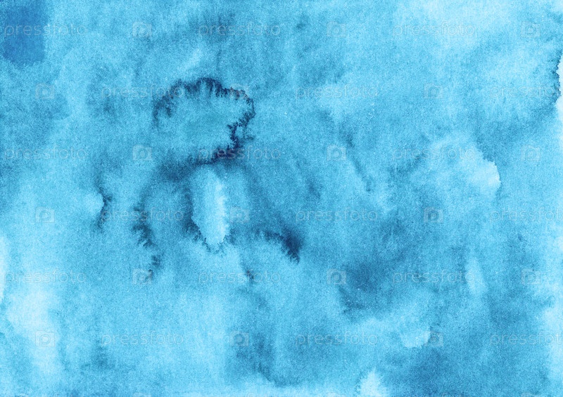Акварель светло-голубой фон. Акварель темно-голубые пятна на бумаге. Художественный жидкий фон