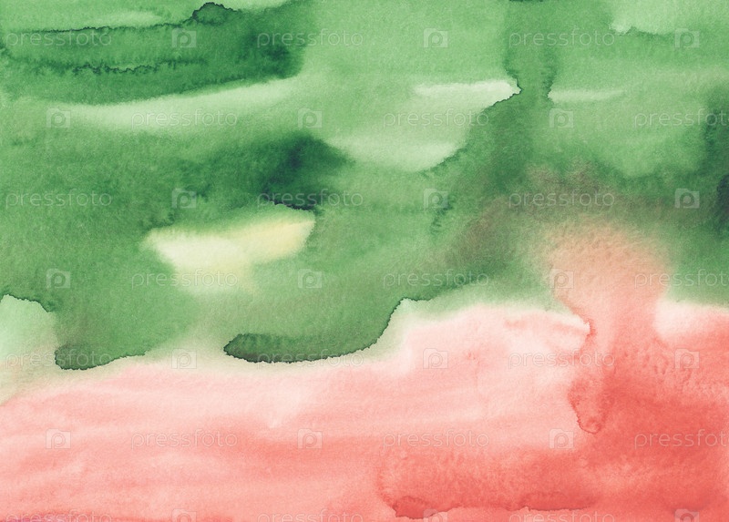 Акварель светло-коралловая и зеленая абстрактная текстура фона. Пятна на бумаге