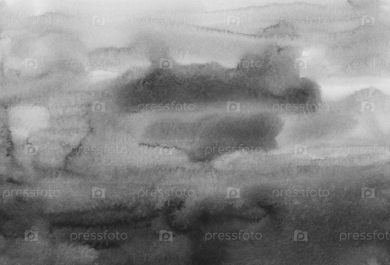 Акварель грязно-серый и черный фон. Монохромные пятна на бумаге. Абстрактный черно-белый фон