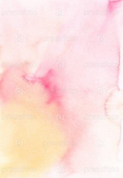Абстрактная пастельная розово-желтая акварельная текстура фона, ручная роспись. Художественный светлый фон цвета фуксии и персика, пятна на бумаге. Обои акварелью розового цвета