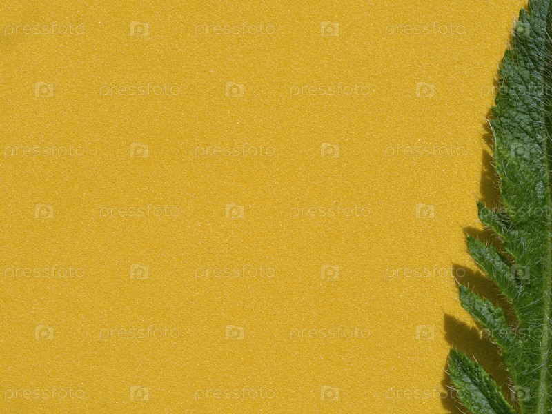 Желтый фон с текстурированным натуральным зеленым листом в качестве рамки. Плоская планировка, вид сверху