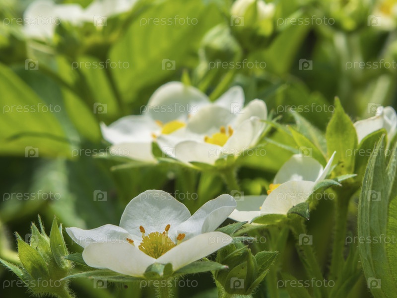 Цветущие кусты клубники в весеннем саду крупным планом, выборочный фокус. Крупный план милого маленького цветка клубники. Цветущий клубничный цветок на фоне зеленых растений в летнем саду