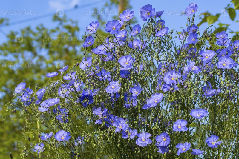 Цветущий лен. Голубые цветы льна на размытом фоне. Яркий нежный голубой цветок декоративного цветка льна и его побег на сложном фоне. Цветы декоративного льна