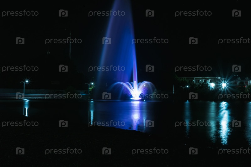Красивый высокий синий с фиолетовым фонтаном в озере. Ночной фонтан с отражением в воде. Также в воде отражаются уличные фонари