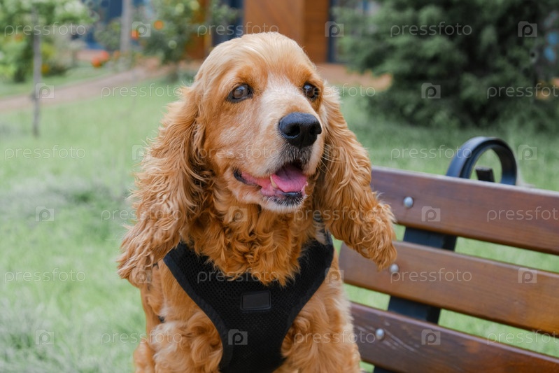 Старый рыжий русский спаниель на скамейке на фоне зелени во время прогулки
