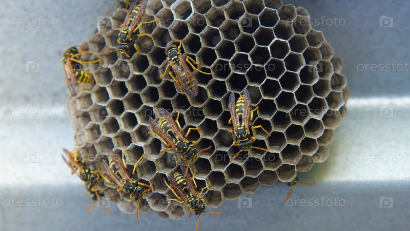 Гнездо обыкновенной оси Vespula vulgaris. Колония ос в улье. Крупный план. Внутри шестиугольной структуры осевого гнезда