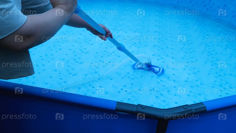 Руки девушки с пылесосом для очистки дна бассейна. Чистка и наполнение бассейна в начале летнего сезона