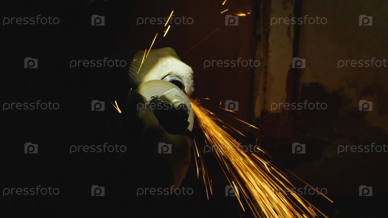 Крупный план мужской руки, работающей на металлической трубе с помощью электрического шлифовального станка. Много искр, летящих в разные стороны в темноте. Тяжелый ручной труд
