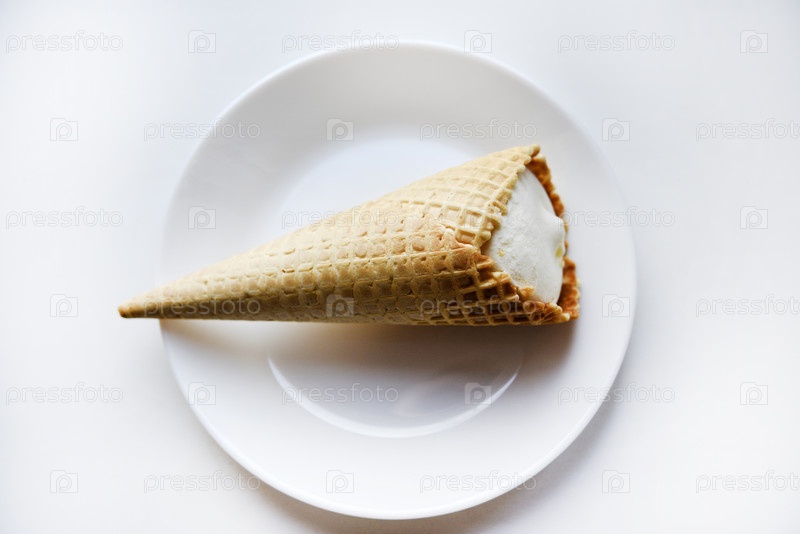 Конус мороженого на белой тарелке. Вкусное мороженое