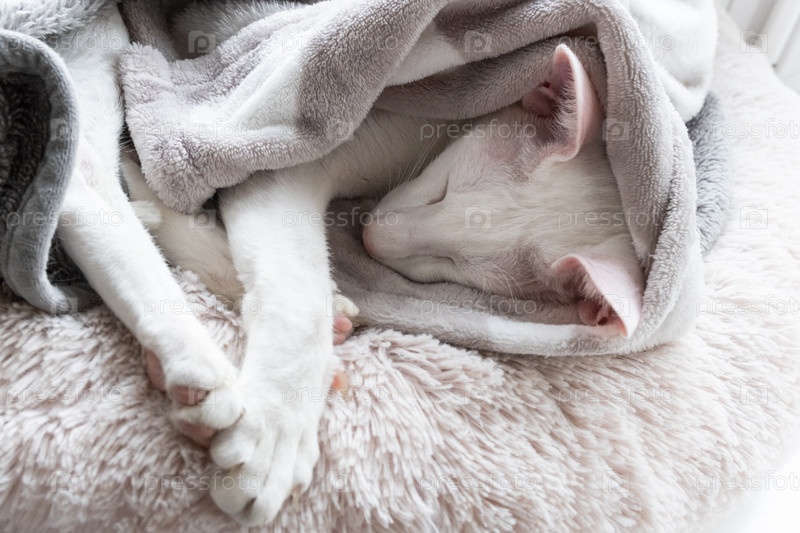 Ориентальная короткошерстная белая кошка спит, завернувшись в одеяло