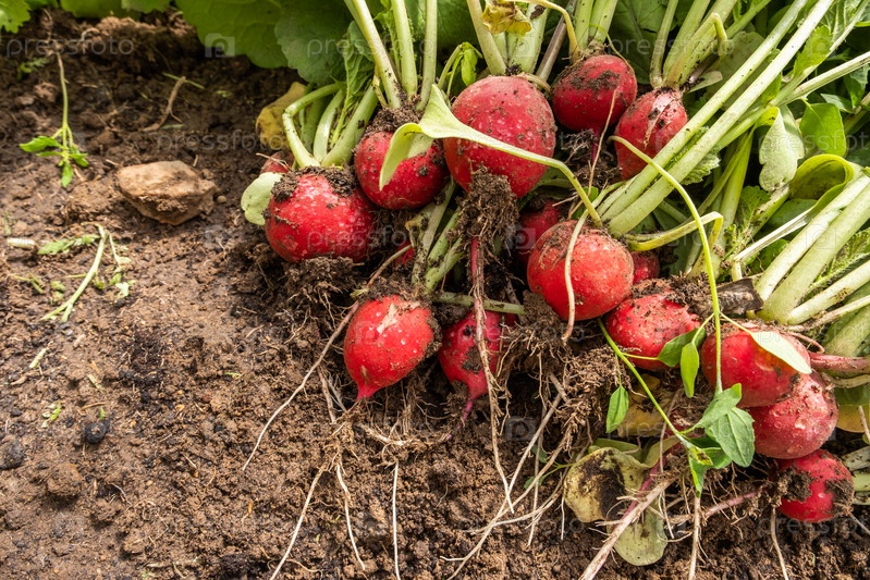 Крупный план урожая редьки лежит на грядке, концепция здорового питания