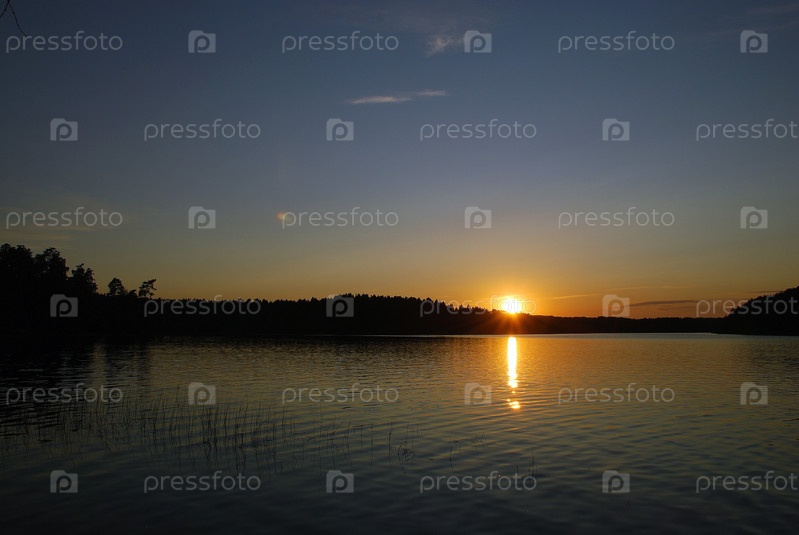 Волшебный закат на берегу озера. Солнце уже касается горизонта над лесом, растущим на берегу озера. Поверхность воды почти гладкая, небо чистое без облаков
