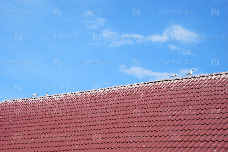 Птицы сидят на красной крыше из металлочерепицы