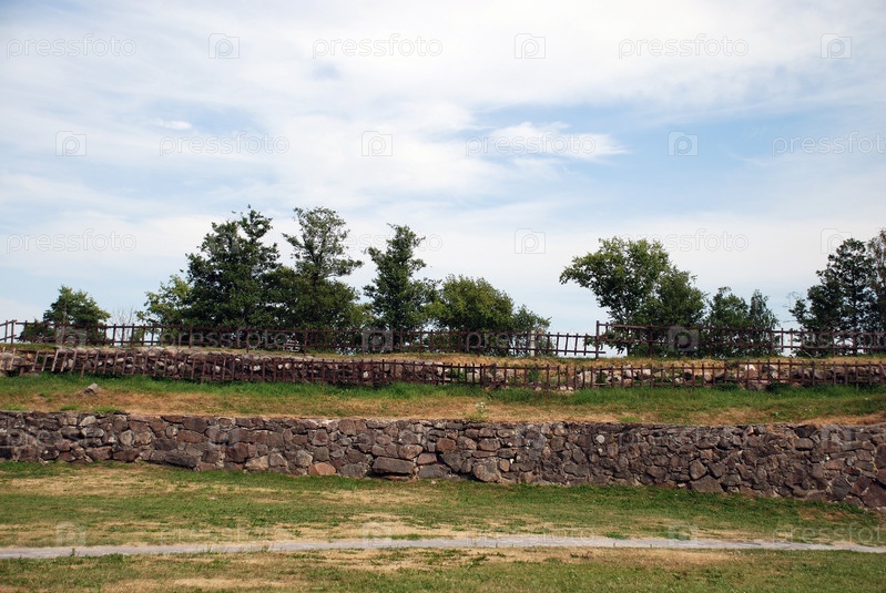 Широкое поле с выжженной солнцем травой. Открытое пространство, где растет трава, частично пожелтело, частично зелено. Площадь обнесена двухуровневой каменной стеной, за ней деревья с зелеными листьями