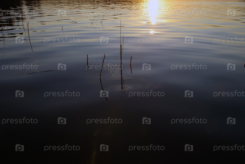 Вечер у водохранилища. Лесное озеро, почти гладь воды, в которой растут зеленые камыши, от воды отражаются лучи заходящего солнца