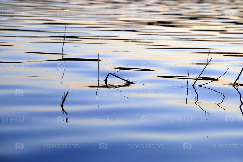 Вечер у водохранилища. Лесное озеро, почти гладь воды, в которой растет зеленый камыш, солнце едва освещает бледно-голубую воду