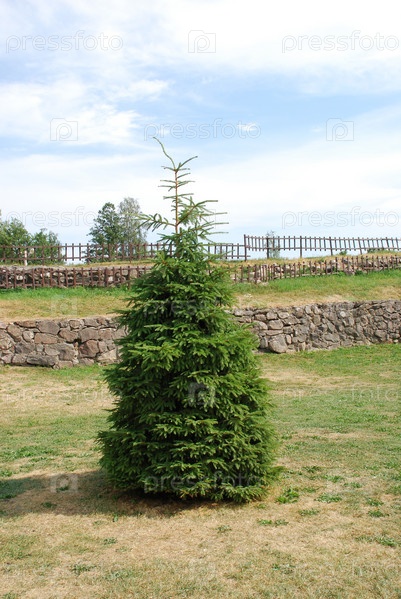 Небольшое пушистое зеленое дерево. Посреди двора крепости маленький едок с зеленой хвоей, вокруг лужайка зеленая, трава местами желтая. за крепостной стеной в два уровня