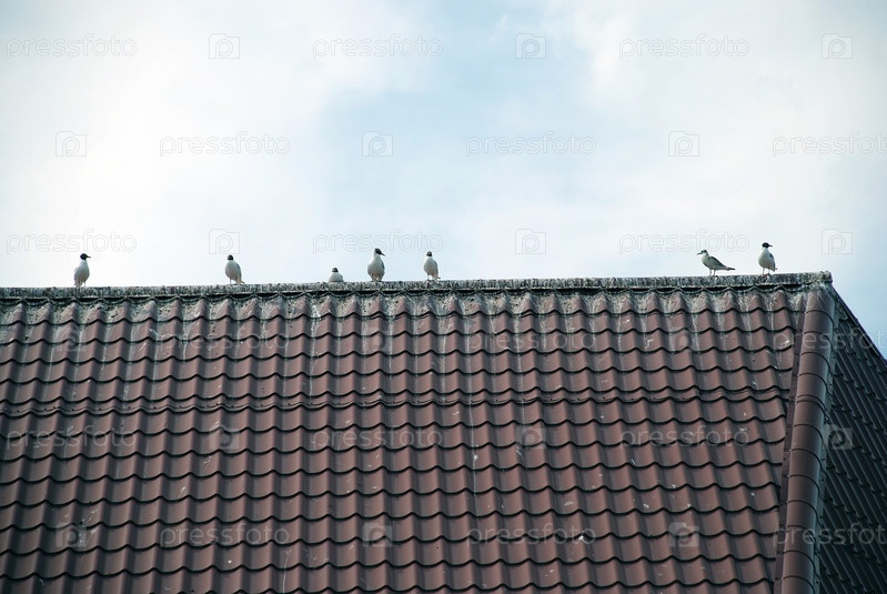Птицы сидят на красной крыше из металлочерепицы