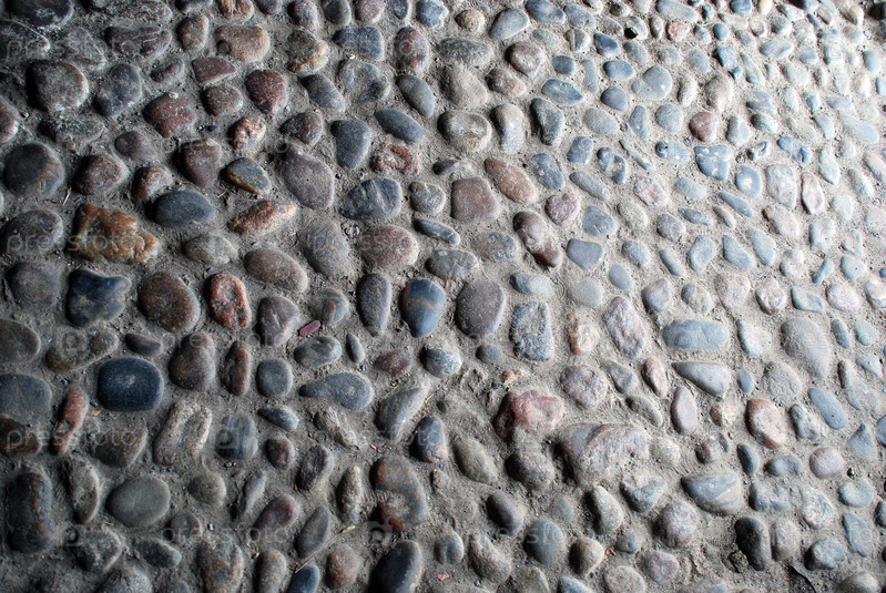 Мощеная мостовая выложена разными камнями. Часть каменной дороги, вымощенной камнями разной формы и цвета. Песок и земля между камнями