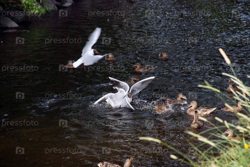 Птицы плавают в речке в ожидании еды. Вода в реке коричневая из-за песка на дне. Утки и чайки плавают в реке, взлетают и садятся на воду в ожидании еды