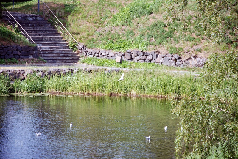 Бетонная лестница с другой стороны. Небольшая речка со спокойной водой, над ней летают белые чайки. С другой стороны склон с зеленой и желтой травой, лестница с перилами