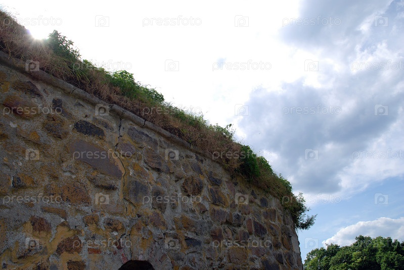 Полукруглая стена старого здания. Светло-коричневая каменная стена старого здания с большой трещиной в камнях. На стене растет трава, на голубом небе белые облака