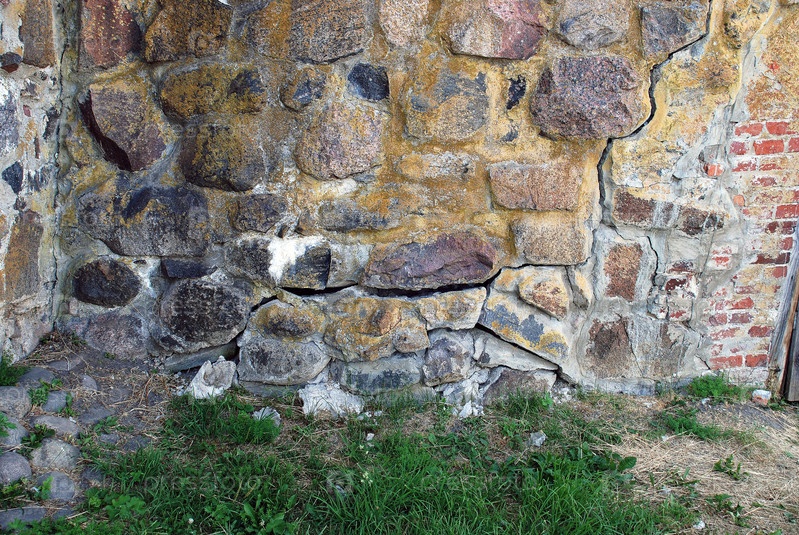 Часть старой стены стены. Кладка заполняется раствором из камней различных форм и размеров. Камни являются частью стены и частично заросли желтым мхом