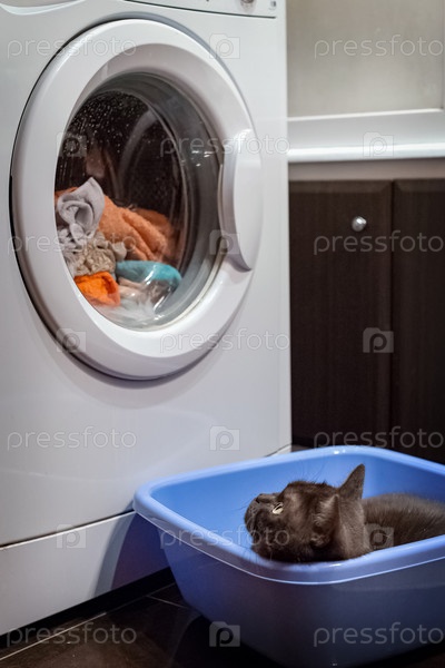 Черный кот сидит в тазу возле стиральной машины