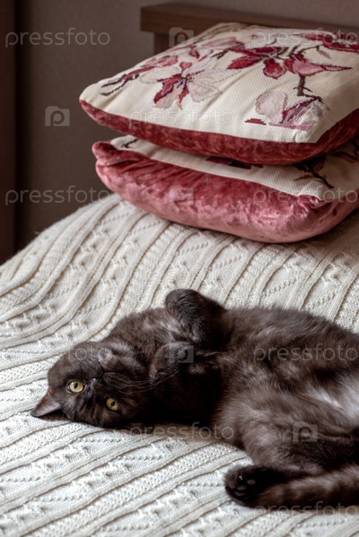 Симпатичная кошка отдыхает на покрывале кровати с вязаным пледом, домашний интерьер спальни