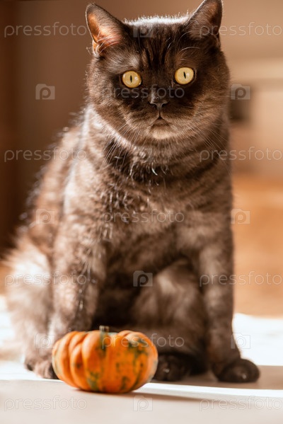 Забавный черный полосатый кот играет с маленькой оранжевой тыквой