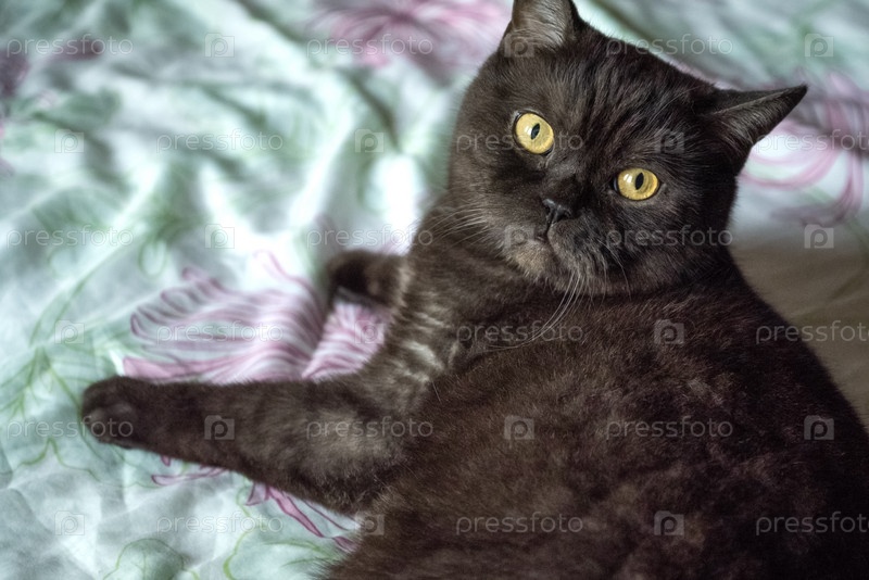 Милый серый чистокровный кот с желтыми глазами лежит на кровати
