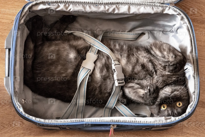 Симпатичный кот, пристегнутый ремнями чемодана. Концепция путешествий и отдыха