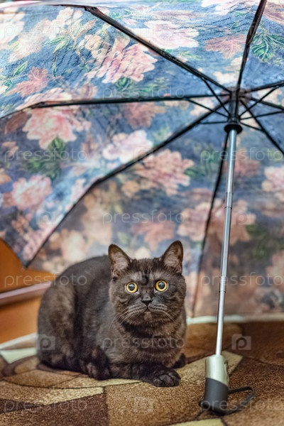 Забавный кот сидит под зонтиком