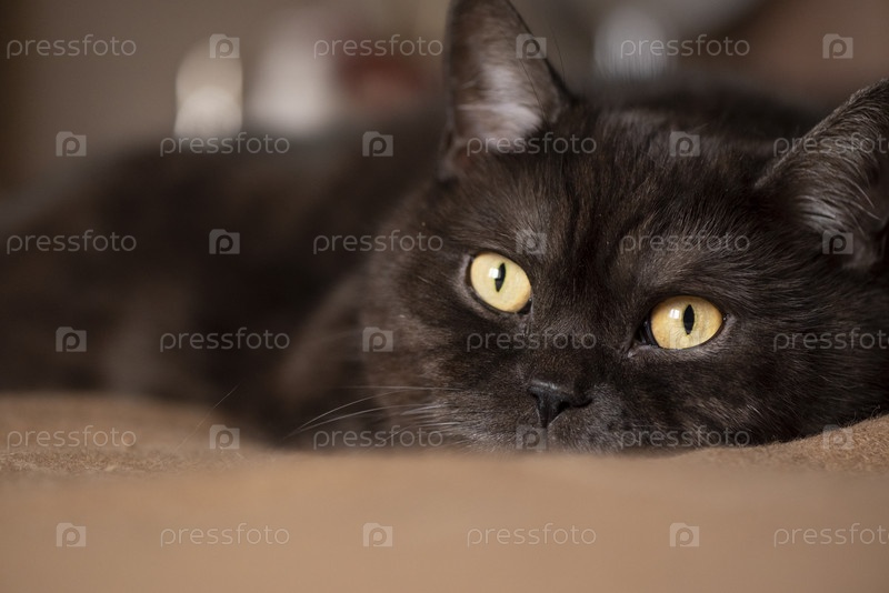 Черный чистокровный кот с большими желтыми глазами лежит на одеяле