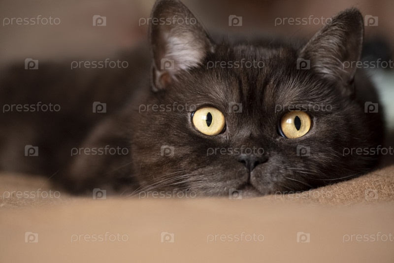 Черный чистокровный кот с большими желтыми глазами лежит на одеяле