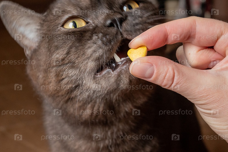 Человек лечит свою кошку витаминными таблетками