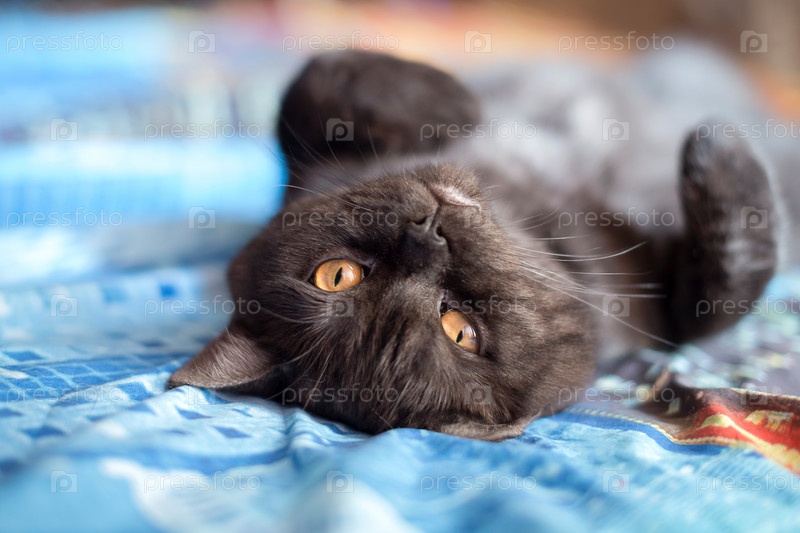 Кот лежит на кровати на спине