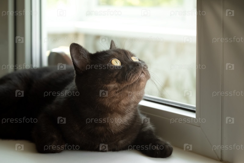 Милый кот с желтыми глазами лежит на подоконнике и смотрит в окно