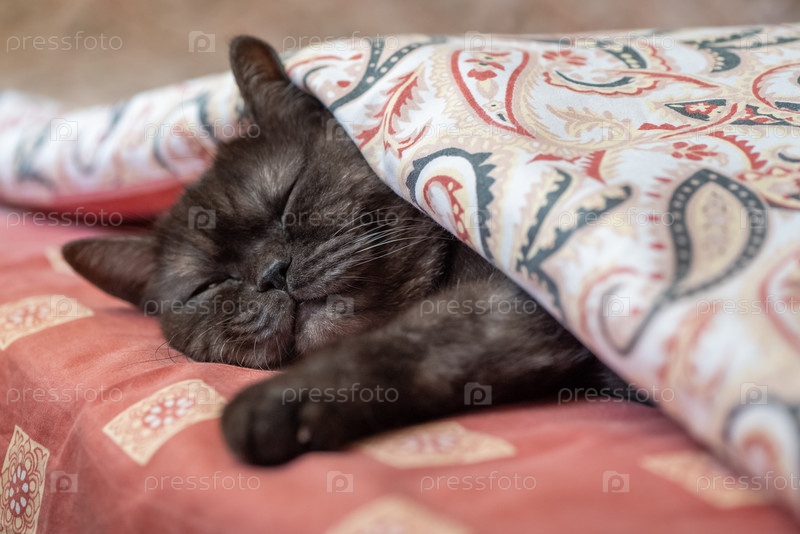 Милый кот спит в постели, покрытый теплым одеялом