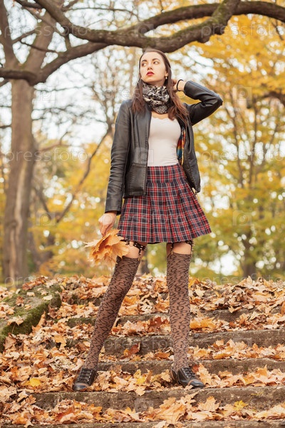 Грустная девушка в осеннем парке с кленовыми листьями стоит