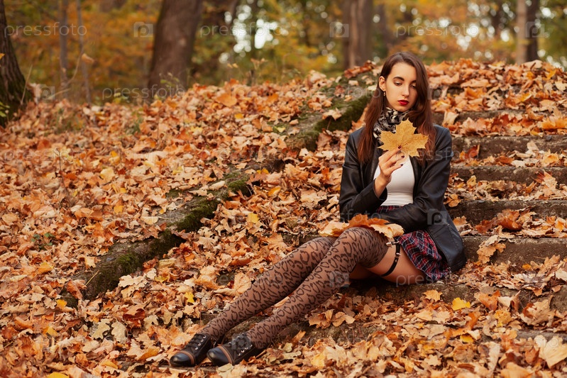 Грустная девушка в осеннем парке с кленовыми листьями сидит