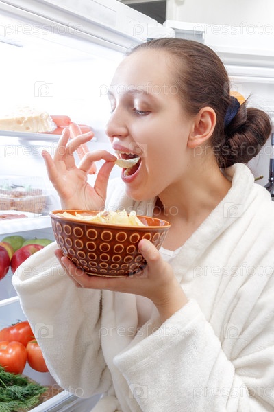 Женщина ест чипсы