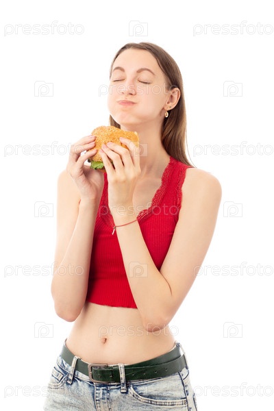 Девушка ест гамбургер