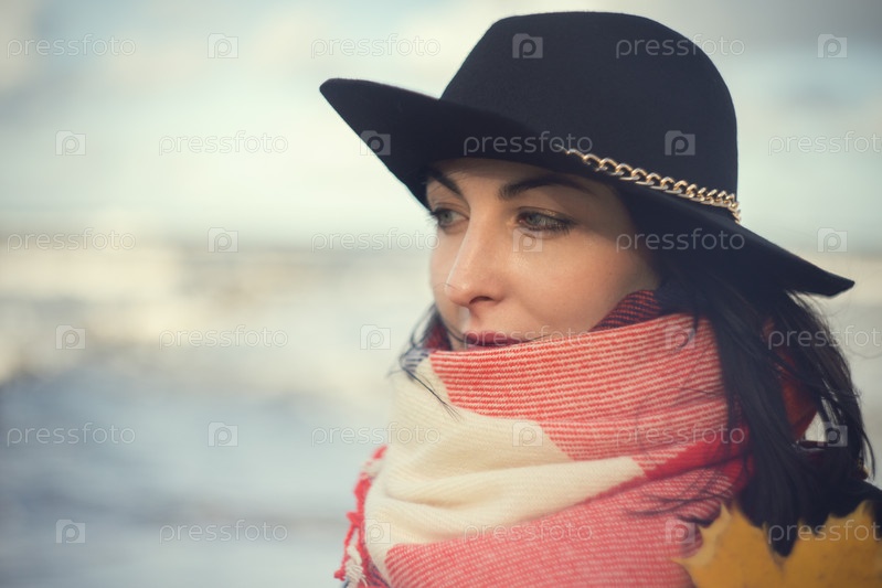 Грустная женщина в черной шляпе на фоне размытого моря
